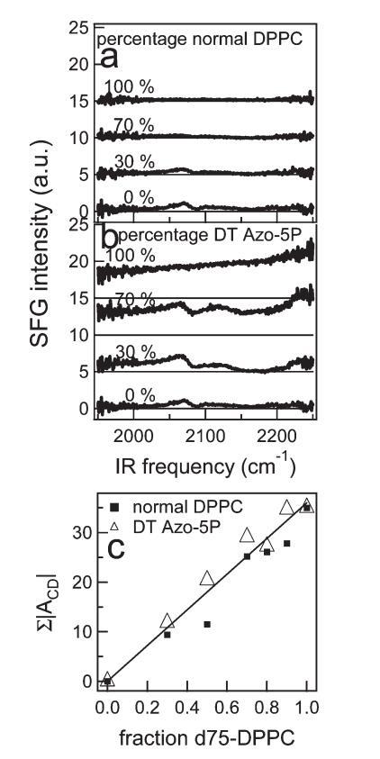 圖9:。(a)正常DPPC和d75 DPPC不同混合物的CD區(qū)VSFG光譜。圖中給出了混合物中正常DPPC的百分比。為清晰起見(jiàn),光譜偏移,細(xì)線(xiàn)表示零。(b)與a部分類(lèi)似,但適用于DT Azo-5P與d75 DPPC的混合物。(c)通過(guò)擬合VSFG光譜獲得的CD振動(dòng)振幅之和,如文中所述,作為含正常DPPC或DT Azo-5P的二元混合物中分?jǐn)?shù)d75 DPPC的函數(shù)。在本實(shí)驗(yàn)中,為了獲得混合物的高質(zhì)量數(shù)據(jù),紅外注量很高,導(dǎo)致通過(guò)VSFG光譜中相對(duì)較高的CH2和CD2振幅觀察到的脂質(zhì)尾部出現(xiàn)小的無(wú)序。