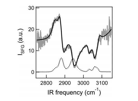 圖3:。在密度為75?2/分子和壓力為~3 mN/m。共振信號(hào)疊加在大型非共振背景上,由于共振信號(hào)和非共振信號(hào)之間的干擾,導(dǎo)致色散線(xiàn)型。黑色虛線(xiàn)表示NR振幅設(shè)置為零時(shí)的DT Azo-5P信號(hào)。