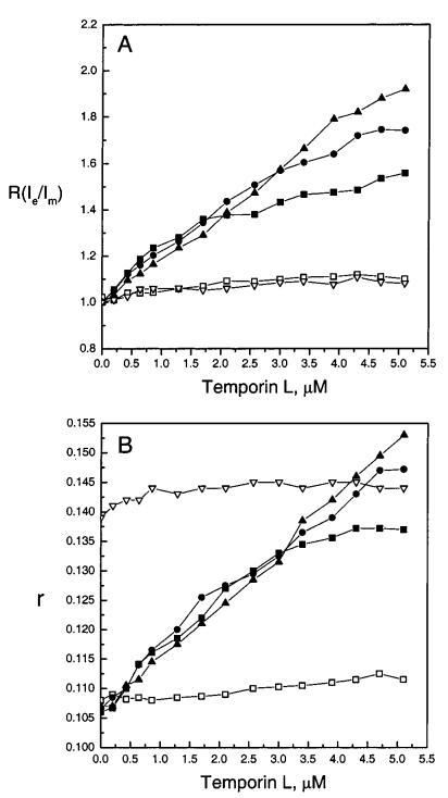 圖5:通過芘標記的磷脂PPDPC(X)0.01)的熒光和DPH(X)0.002的穩態發射各向異性r評估顳葉素L對LUV中脂質動力學的影響,顯示為含XPOPG)0(0)、0.10(9)、0.20(B)和0.40(2)的SOPC脂質體中歸一化準分子與單體比率r(Ie/Im)(圖A)和各向異性r(圖B)的變化,Xchol)0.10(3)。每個數據點代表三次測量的平均值。標準偏差小于0.02(面板A)和0.004(面板B),為清楚起見,未顯示。否則情況如圖2圖例所示。