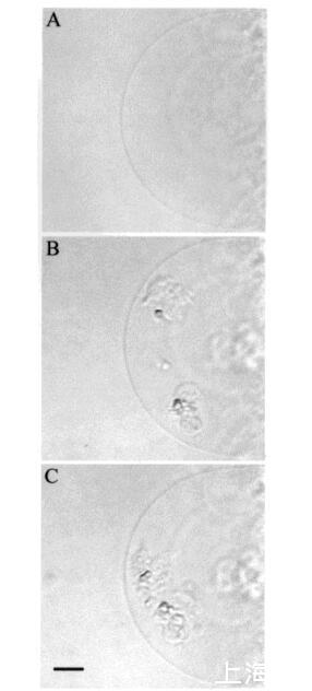 時間蛋白對膜拓撲結構的影響。巨大脂質體是生物膜的優秀模型,因為其尺寸與細胞相當。此外,它們可以通過光學顯微鏡進行觀察(15,21)。我們之前對馬加寧2和吲哚肽的研究表明,這些肽對巨大脂質體膜的拓撲結構有顯著影響(15)。在本研究中,在類似條件下,通過顯微鏡觀察了在巨大囊泡外表面添加這些肽后,temporins對巨大脂質體三維拓撲結構的影響。SOPC巨脂質體即使暴露于大量該肽(約1.2 fmol的temporin B)(每個重復100份12 amol)時,也不受temporin B的影響。同樣,含有膽固醇(Xchol)0.10)的巨大囊泡也不受該量的顳葉素B的影響。然而,在將該肽添加到SOPC和SOPC/膽固醇(Xchol)0.10)巨大脂質體的表面時,偶爾會觀察到相鄰囊泡之間的粘附(數據未顯示)。然而,在POPG(XPOPG)0.10的存在下,已經≈36 amol(10-18 M)的顳葉素B(約60 fL,3次注射)施加在巨大囊泡表面上,引起巨大囊泡膜拓撲結構的顯著變化(圖6,面板B)。具體來說,小顆粒(φ≈10μm),然后進入巨大脂質體的內腔(圖6,面板B)。進一步增加≈0.24 fmol的顳蛋白B(約400 fL,20次注射)導致巨大囊泡內這些顆粒的數量增加(圖6,面板C)。還觀察到巨大囊泡表面的顆粒聚集(圖6,面板C)。隨后,在≈10分鐘后,將顆粒轉移到巨大脂質體的內腔中。