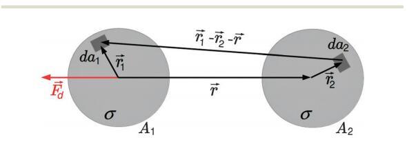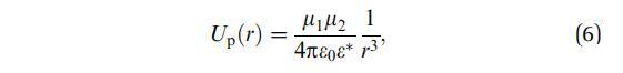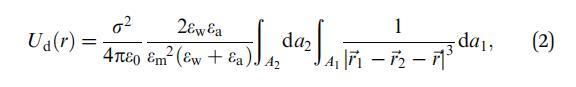 其中Ai表示域i的面積,dai表示其面積元素,-ri表示其相對于域中心的位置向量,i=1,2-r是從域1中心到域2中心的向量,如圖1所示。e0是真空介電常數(shù),ew和ea分別是水和空氣的相對介電常數(shù)。在這里,我們使用了Urbakh等人21的研究結(jié)果,該研究描述了由兩個(gè)半無限介質(zhì)包圍的薄電介質(zhì)層中偶極子之間的相互作用。
