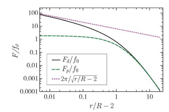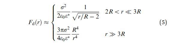 圖2顯示了兩個(gè)半徑相等的圓形區(qū)域的Fd(r)(實(shí)線)和Fp(r)(虛線)。疊加在等式(4)的數(shù)值解上,我們添加了等式(5)(虛線)的短距離的漸近表達(dá)式。注意,當(dāng)兩個(gè)域接近接觸(r=2R)時(shí),F(xiàn)d發(fā)散,而Fp保持有限。此外,對于實(shí)驗(yàn)感興趣的范圍2R o r o 10R,兩個(gè)力之間的差異是可觀的。特別是,即使r=5R,差值也在15%左右。