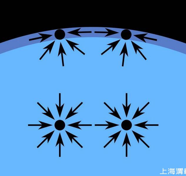 表面張力是流體表面存在的可能收縮到最小表面積的趨勢力;它是液體分子由于凝聚力相互吸引而在其表面形成的內(nèi)向力;它就像是一張覆蓋在液體表面被拉伸的彈性薄膜,可以承受一定重量的外在壓力。