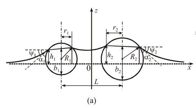 從能量的角度來看,液體表面能并不是由獨立放置單個小球時液面表面能的簡單相加,還要加上一項因另外一個小球存在時的相互表面能,其與小球之間的距離直接相關(guān)。這種相互表面能表現(xiàn)為沿小球連線方向的橫向毛細(xì)力。