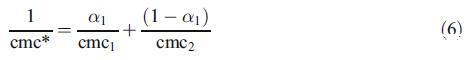 為了討論由兩種二元混合物形成的混合膠束的性質(zhì),即混合膠束是否顯示理想或非理想行為,我們使用了偽相分離模型[19]。根據(jù)該模型,膠束被認為是與含有相應(yīng)單體的溶液平衡的宏觀相。對于二元表面活性劑混合物,理想cmc由方程[19]關(guān)聯(lián):