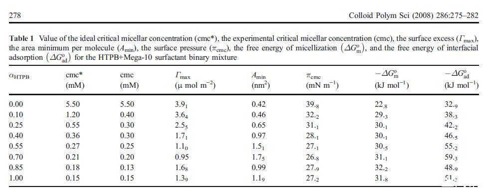 根據(jù)cmc值,還可以根據(jù)以下方程[1]評估膠束化的標準自由能ΔGo m: