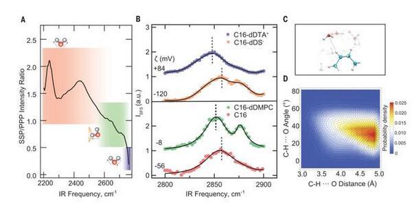 綜上所述,疏水油滴接觸界面水結構的特征是水和油分子之間的電荷轉移相互作用,這種電荷轉移作用源于非常規(guī)的C-H···O H鍵。與平面氣-水界面相比,油滴表面的水具有更強的H鍵網絡。界面O-D和C-H的光譜位移為水向油的電荷轉移提供了證據(jù),解釋了裸油滴在水中的負電荷和穩(wěn)定性。