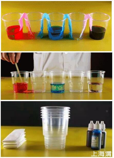 實驗材料:紙巾、透明杯子、色素(紅、綠、藍或任意三種顏色)