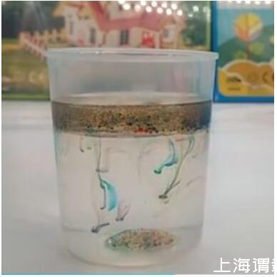 解密時刻:水不溶于油且水比油重,顏料在油中會下沉,下沉到水油交界面時,顏料溶于水中,于是就看到了彩虹雨。