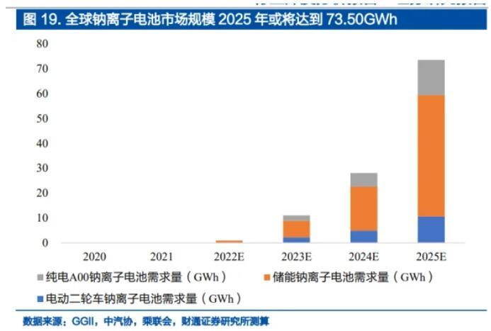我們預計2025年鈉離子電池市場規模為398億元,2022-2025年年復合增速超300%,市場需求直接從21年0GWh增長到25年的73.50GWh。其中,電動二輪車領域,鈉離子電池需求規模從2021年的0GWh增長到2025年的10.63GWh;儲能領域,鈉離子電池需求規模從2021年的0GWh增長到2025年的48.74GWh;純電A00領域,鈉離子電池需求規模從2021年的0GWh增長到2025年的14.13GWh。