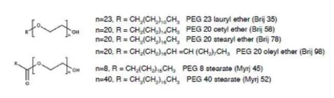 如果將不同分子量的聚乙二醇單鏈與簡單的脂肪烷基長鏈連接,就獲得聚乙二醇烷基醚(Polyoxyethylene Alkyl Ethers),包括月桂醚烷基、油醇醚烷基、硬脂醇烷基、十六烷基等,在制劑中可作為乳化劑、增溶劑和潤濕劑等。