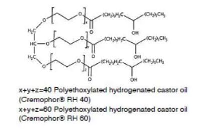 另一類重要的非離子表面活性劑是聚氧乙烯蓖麻油(Cremophor)或聚氧乙烯氫化蓖麻油(Cremophor RH)。蓖麻油是蓖麻油甘油三脂,與環氧乙烯反應,親水性的氧化乙烯結構便插入到蓖麻酸和甘油之間,便得到了聚氧乙烯蓖麻油,如果蓖麻油中的雙鍵加氫飽和后,再與環氧乙烯反應,那么得到的便是聚氧乙烯氫化蓖麻油。環氧乙烯和蓖麻油的反應位點是隨機的,因此得到的表面活性劑是一種混合物,也包括未反應的蓖麻油和均聚形成的聚氧乙烯。不同種類的聚氧乙烯蓖麻油或聚氧乙烯氫化蓖麻油是通過參與反應的氧化乙烯和蓖麻油或氫化蓖麻油的比例決定的,例如Cremophor EL 40或Cremophor RH 40,其中40代表的便是混合物中氧化乙烯和蓖麻油的摩爾比。這類表面活性劑的HLB一般在12以上,常用作難溶性藥物的增溶。