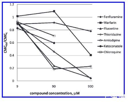 圖4.CMC移位(通過將藥物-脂質(zhì)復(fù)合物(DL的CMC之間的比率表示)和單獨(dú)的脂質(zhì)(L)的CMC:CMC測試化合物與二FF erent科幻最終在濃度樣品孔在pH7.2。
