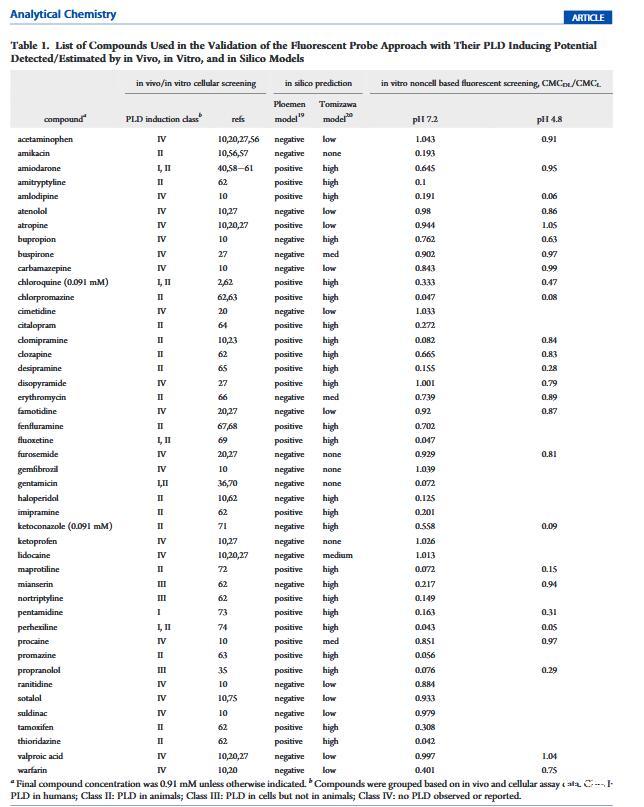 測定pH影響。PLD中的脂質(zhì)紊亂主要在構(gòu)成酸性的溶酶體區(qū)室中觀察到環(huán)境。為了模擬溶酶體條件,pH 4.8醋酸鹽在PLD篩選研究中使用緩沖液,25種進(jìn)行研究使用上述相同的程序商業(yè)化合物(表1)對。大多數(shù)化合物在結(jié)果相似兩種緩沖液中的;然而,胺碘酮、氯米帕明、米安色林和華法林給出了截然不同的數(shù)據(jù),將前三種化合物從PLD誘導(dǎo)劑轉(zhuǎn)移到非誘導(dǎo)劑,將華法林劑轉(zhuǎn)移從非誘導(dǎo)到誘導(dǎo)劑,從pH 7.2到pH 4.8。