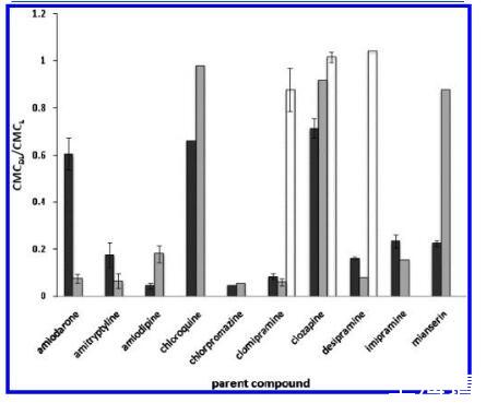 圖5.CMC偏移(由CMC之間的比率表示)藥物-脂質復合物(DL)和單獨脂質的CMC(L):CMCDL/CMCL)的測試化合物(黑色)及其主要代謝物(灰色、初級代謝物;白色,次生代謝物)在pH 7.2中分析HEPES緩沖液。使用的藥物濃度為1 mM,除非另有說明見表2。誤差線被分配給那些n g3測試的化合物。對于氯氮平和米安色林,均為0.91和0.091 mM用于測試,但僅來自1 mM測試的數(shù)據(jù)被策劃。