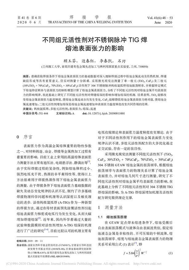【摘要】:準確獲取焊接條件下熔池金屬表面張力的基礎(chǔ)數(shù)據(jù)對深入理解焊接過程中熔池金屬流動及傳熱機制、焊縫缺陷形成等具有重要意義,但實時測量十分困難。采用激光視覺法測量了單一組元(TiO_2,CaF_2)及二組元(30%TiO_2+70%CaF_2,70%TiO_2+30%CaF_2)活性劑下304不銹鋼脈沖鎢極氬弧焊熔池振蕩頻率,并根據(jù)特定模式下熔池特征頻率與表面張力的解析模型計算了熔池金屬表面張力,分析了不同組元活性劑對熔池金屬平均表面張力的影響規(guī)律,在此基礎(chǔ)上研究了不同組元活性劑對焊縫熔深的影響和增加熔深的機理。結(jié)果表明,TiO_2能夠改變?nèi)鄢亟饘俦砻鎻埩囟忍荻龋谷鄢亟饘倭鲃臃较虬l(fā)生變化,CaF_2能夠降低熔池金屬表面張力絕對值,使熔池金屬流速增加;二組元活性劑增加熔深是熔池金屬流速增加和表面張力溫度梯度改變共同作用的結(jié)果。