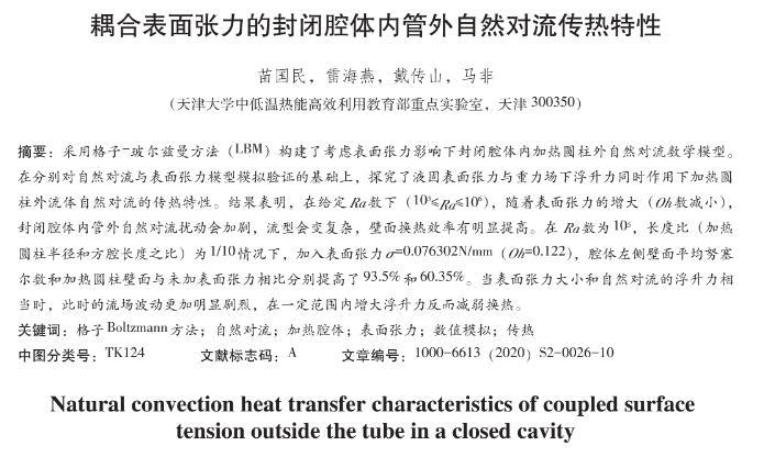 【摘要】:采用格子-玻爾茲曼方法 (LBM)構建了考慮表面張力影響下封閉腔體內加熱圓柱外自然對流數學模型。在分別對自然對流與表面張力模型模擬驗證的基礎上,探究了液固表面張力與重力場下浮升力同時作用下加熱圓柱外流體自然對流的傳熱特性。結果表明,在給定Ra數下(103≤Ra≤106),隨著表面張力的增大(Oh數減小),封閉腔體內管外自然對流擾動會加劇,流型會變復雜,壁面換熱效率有明顯提高。
