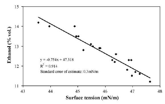 如統(tǒng)計(jì)分析所示,乙醇、單寧和蛋白質(zhì)是與表面張力最相關(guān)的三個(gè)參數(shù)。 一方面考慮到它們在釀酒學(xué)上的重要性,另一方面考慮到它們的測定方法費(fèi)力,我們使用回歸分析研究了各種數(shù)學(xué)模型,目的是通過簡單的表面測量獲得評(píng)估其濃度水平的預(yù)測模型。緊張。 正如預(yù)期的那樣,最適合的模型用于估計(jì)乙醇含量。 描述它的散點(diǎn)圖和線性方程如圖 2 所示。該模型將乙醇濃度的變化解釋為 91.4%,估計(jì)的標(biāo)準(zhǔn)誤差等于 0.3 mN/m。
