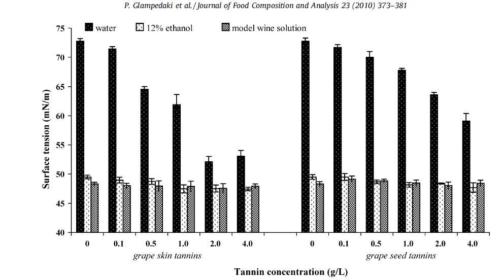 為了突出葡萄酒主要成分對表面張力的影響,制備了乙醇、蛋白質(zhì)和單寧標(biāo)準(zhǔn)溶液,并在三種不同的基質(zhì)中測定了它們的表面張力:水、水/乙醇混合物(12%,v/v 乙醇)和模型葡萄酒溶液(12%,v/v 乙醇,2 g/L 酒石酸,pH 3.5)。 研究的濃度在通常在葡萄酒中發(fā)現(xiàn)的范圍內(nèi)。 選擇 BSA 作為參考蛋白質(zhì),代表表面活性蛋白質(zhì)。 眾所周知,BSA 具有與廣泛使用的表面活性劑十二烷基硫酸鈉 (SDS) 相當(dāng)?shù)膬?yōu)異發(fā)泡性能(Razafindralambo 等,1996)。 結(jié)果如表 1 所示。使用市售的釀酒單寧(從葡萄皮和種子中提取的單寧的天然混合物),因?yàn)樗鼈儽徽J(rèn)為是葡萄酒中天然存在的單寧的代表。 結(jié)果如圖1所示。