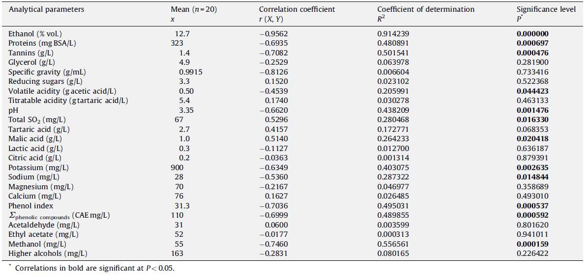 為此,對 20 種靜止、白色和紅色希臘單品種葡萄酒樣品進(jìn)行了常規(guī)釀酒學(xué)參數(shù)(乙醇含量、比重、還原糖、可滴定酸度、揮發(fā)性酸度、總 SO2 和 pH 值)和表面張力的測定。 還進(jìn)行了使用 HPLC 測定有機(jī)酸(酒石酸、蘋果酸、乳酸和檸檬酸)、陽離子(鉀、鈉、鎂和鈣)、甘油和酚類化合物以及使用氣相色譜法測定揮發(fā)性化合物的基本儀器分析。 最后,采用光譜法進(jìn)行總酚指數(shù)、單寧和蛋白質(zhì)測定。 結(jié)果如表 2 和表 3 所示。關(guān)于蛋白質(zhì)測定,可能影響所有樣品的系統(tǒng)分析誤差可視為不影響最終值,因?yàn)樗芯康钠咸丫凭哂邢嗨频囊掖己俊?此外,在葡萄酒樣品中加入已知量的標(biāo)準(zhǔn) BSA 溶液進(jìn)行的分析未發(fā)現(xiàn)對蛋白質(zhì)測定有任何干擾(數(shù)據(jù)未顯示)。 上述數(shù)據(jù)與表面張力的相關(guān)性分析結(jié)果如表4所示。