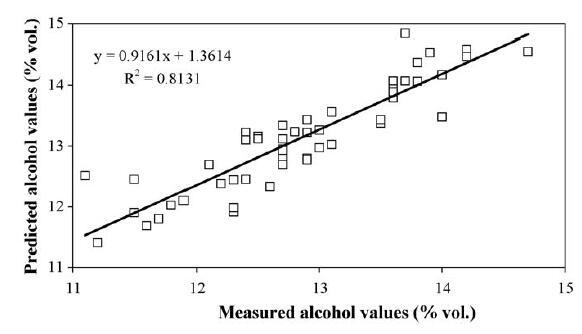 為了測試乙醇預(yù)測模型,我們分析了第二組 30 個(gè)葡萄酒樣品。 所提出的線性模型預(yù)測的值與葡萄酒酒精度等級(jí)的測量值的圖如圖 3 所示。更新的模型解釋了 81.3% 的乙醇含量變化,而現(xiàn)在估計(jì)的標(biāo)準(zhǔn)誤差為 0.36 % (v/v)。 盡管必須進(jìn)一步優(yōu)化,但該統(tǒng)計(jì)工具為文獻(xiàn)中現(xiàn)有的那些提供了一種額外的方法,用于簡單快速地估計(jì)靜止葡萄酒的酒精等級(jí)(Rocchia 等,2007a,b)。