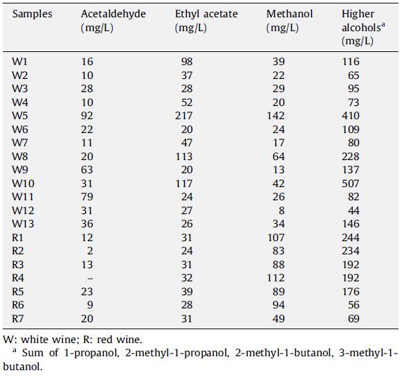 表 3 在 20 個(gè)葡萄酒樣品中測定的揮發(fā)性化合物濃度的平均值。