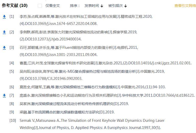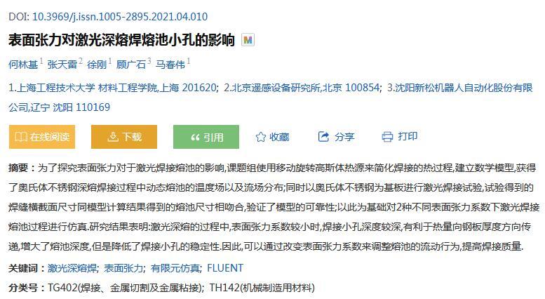 【摘要】:為了探究表面張力對于激光焊接熔池的影響,課題組使用移動旋轉高斯體熱源來簡化焊接的熱過程,建立數學模型,獲得了奧氏體不銹鋼深熔焊接過程中動態熔池的溫度場以及流場分布;同時以奧氏體不銹鋼為基板進行激光焊接試驗,試驗得到的焊縫橫截面尺寸同模型計算結果得到的熔池尺寸相吻合,驗證了模型的可靠性;以此為基礎對2種不同表面張力系數下激光焊接熔池過程進行仿真。