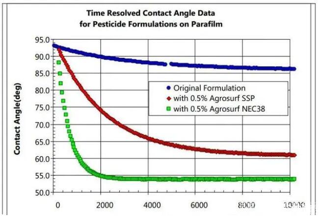 在農作物生長過程中,病、蟲、草害種類繁多,適宜的噴灑農藥可以保證農作物的健康成長。農藥的防治效果直接與藥液對植株上的潤濕有關,不同植物表面的形態不一樣,或親水,或疏水。許多植物、害蟲、雜草不易被水潤濕,是因為該植物表面存在一層疏水的蠟層,需要在水中加入表面活性劑,以增加它們的親水性。農藥中加入表面活性劑,可以降低液體的表面張力,提高潤濕分散性能,而潤濕則離不開藥液的動態表面張力、表面張力、藥液在葉面上的接觸角等。