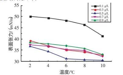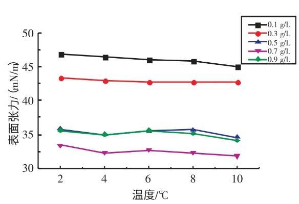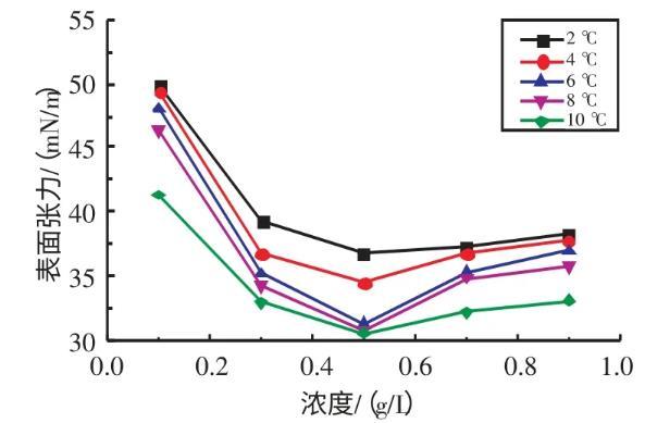 2.2.1不同溫度下十二烷基苯磺酸鈉溶液表面張力與濃度的關系實驗研究了在溫度為2、4、6、8、10℃條件下,SDBS溶液的表面張力與濃度的關系(見圖3)。由圖3可知,當濃度在0.1~0.7 g/L時,隨著SDBS溶液濃度的升高,其表面張力逐漸減??;當濃度在0.7~0.9 g/L時,隨著SDBS溶液濃度的升高,其表面張力逐漸增大。當SDBS溶液濃度為0.7 g/L時,其表面張力取得最小值。