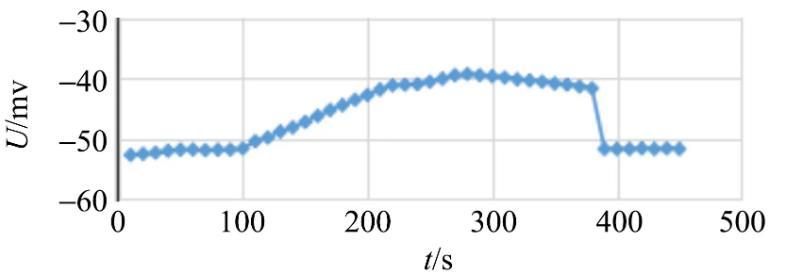 實驗過程:接通電源,將儀器預熱15min;在傳感器橫梁端頭的小鉤上掛砝碼盤并進行定標;將金屬吊環清潔干凈,調平后掛在傳感器的小鉤上;實驗時,先將吊環置于密度較大的液體Ⅰ中,然后再注入密度較小的液體Ⅱ,調節流速調節器控制從容器底部緩慢勻速排出液體的流速,測量出電壓U隨時間t的變化曲線。圖2為純凈水和硅油的界面張力測量過程中電壓U隨時間t的變化曲線。