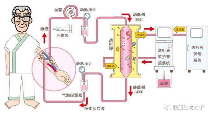 血液透析是急慢性腎功能衰竭患者腎臟替代治療方式之一。通過將體內血液引流至體外,經一個由無數根空心纖維組成的透析器中,血液與含機體濃度相似的電解質溶液(透析液)在一根根空心纖維內外,隔著半透膜進行透析,通過彌散、超濾、吸附和對流原理進行物質交換,清除體內的代謝廢物、維持電解質和酸堿平衡;同時清除體內過多的水分,并將經過凈化的血液回輸的整個過程稱為血液透析。
