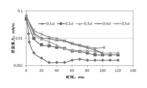 圖3、圖4是根據(jù)前述實(shí)驗(yàn)步驟1、2提供的配置與測(cè)量方法,油滴注入量分別為0.1μL、0.2μL、0.3μL、0.4μL、0.5μL,無堿二元驅(qū)配方體系與高凝油間界面張力的關(guān)系曲線。從圖2可知:無堿二元驅(qū)配方體系與高凝油間的界面張力達(dá)到超低界面張力的時(shí)間隨著油滴注入量的增多明顯延長(zhǎng),注入油滴0.1μL,4分鐘達(dá)到超低界面張力,注入油滴0.5μL,40分鐘達(dá)到超低界面張力;從圖4可知:注入油滴量大于0.3μL以后,對(duì)無堿二元驅(qū)配方體系與高凝油間界面張力的測(cè)定不能持續(xù)2小時(shí),油滴在100分鐘發(fā)生斷開,對(duì)于高凝油而言,油滴注入量小于0.3μL較適合。